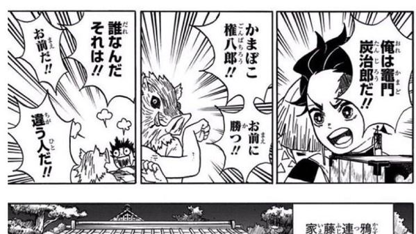 原作第4巻27話(アニメ1期14話)で、炭治郎に「かまぼこ権八郎!!お前に勝つ!!」と宣言するシーン。
